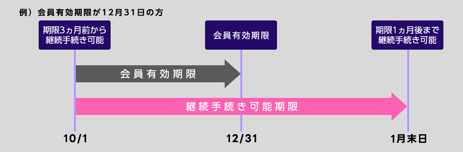継続手続きは、会員有効期限の3ヵ月前から1ヵ月後の末日まで行っていただくことが可能です。